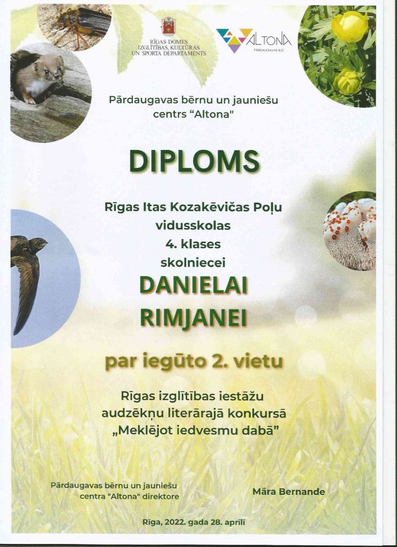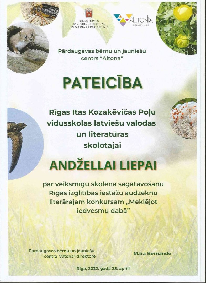 Par dalību un rezultātiem Rīgas izglītības iestāžu audzēkņu literārajā konkursā “Meklējot iedvesmu dabā”.