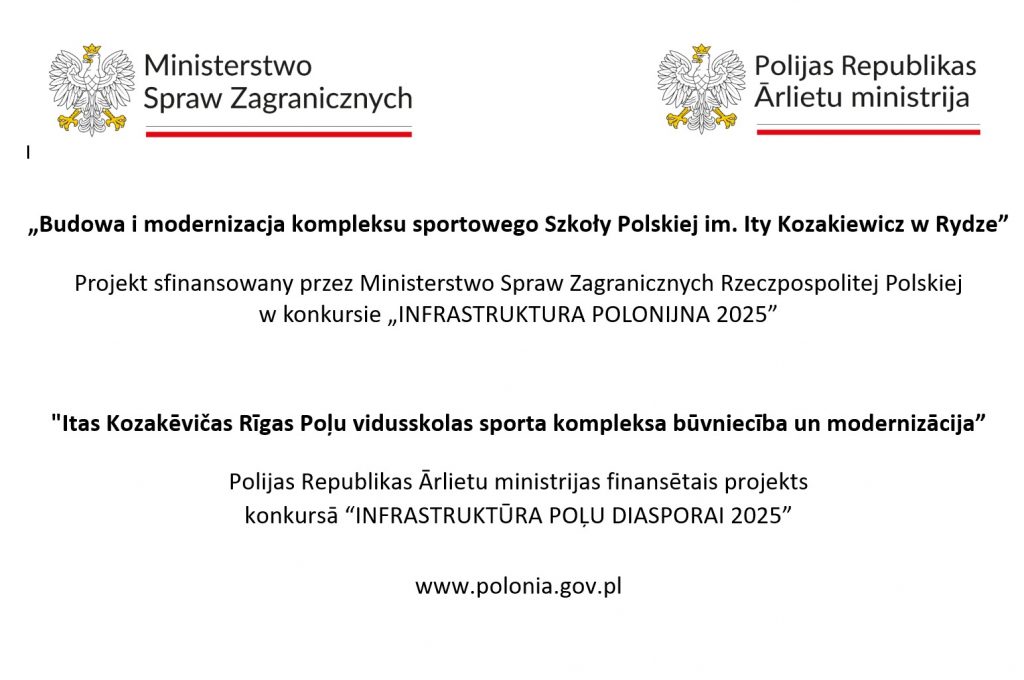 Realizacja przedsięwzięcia rozpoczęła się w 2025 roku i ma na celu stworzenie bezpiecznych, nowoczesnych warunków do zajęć sportowych. Projekt jest realizowany we współpracy z Samorządem Miasta Rygi i Polską Szkołą Średnią im. Ity Kozakiewicz, co stanowi istotny impuls dla rozwoju placówki oraz lokalnej społeczności polskiej.