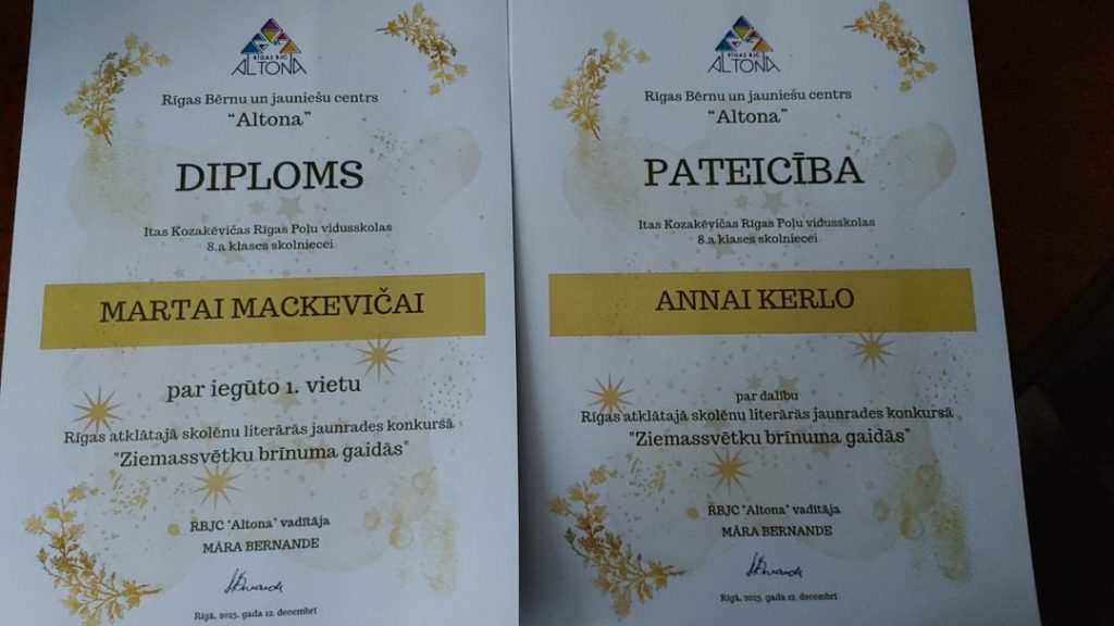 No 2025. gada 27. oktobra līdz 2025.gada 28. novembrim norisinājās Rīgas Bērnu un jauniešu centra “Altona” rīkotais Rīgas atklātais literārās jaunrades konkurss “Ziemassvētku brīnuma gaidās”. Konkursa mērķi bija veicināt bērnu un jauniešu radošumu, bagātināt valodas krājumu un fantāziju, attīstīt spēju izteikties.