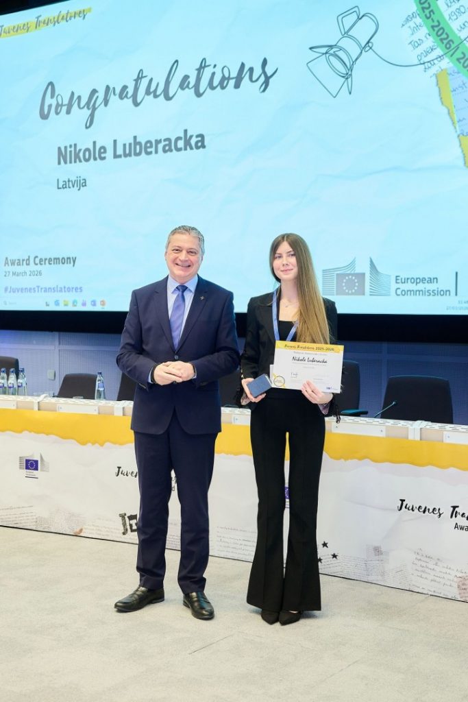 27. martā Briselē, Eiropas Komisijas Charlemagne ēkā, norisinājās svinīgā balvu pasniegšanas ceremonija konkursā Juvenes Translatores, ko rīko Eiropas Komisijas Rakstiskās tulkošanas ģenerāldirektorāts. Šis ir prestižs Eiropas mēroga konkurss, kura mērķis ir veicināt valodu apguvi un atbalstīt jauno tulkotāju talantus visās ES dalībvalstīs.
